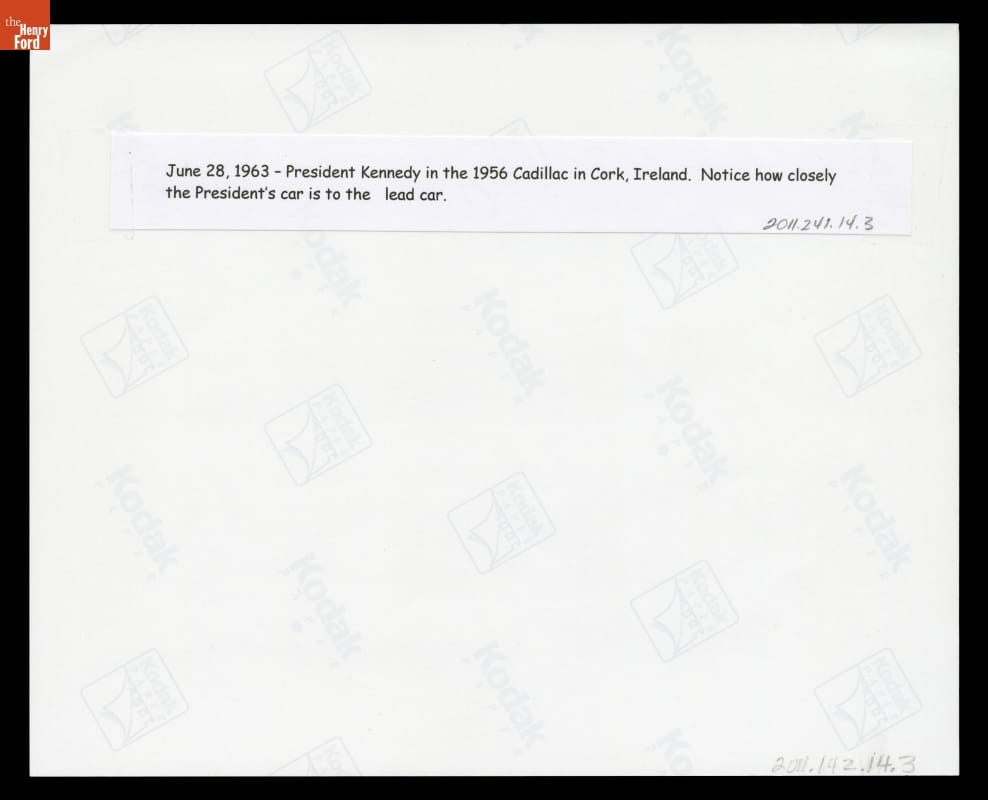 Typed paper adhered to back of image reads: June 28, 1963- President Kennedy in the 1956 Cadillac in Cork, Ireland. Notice how closely / the President's car is to the lead car.