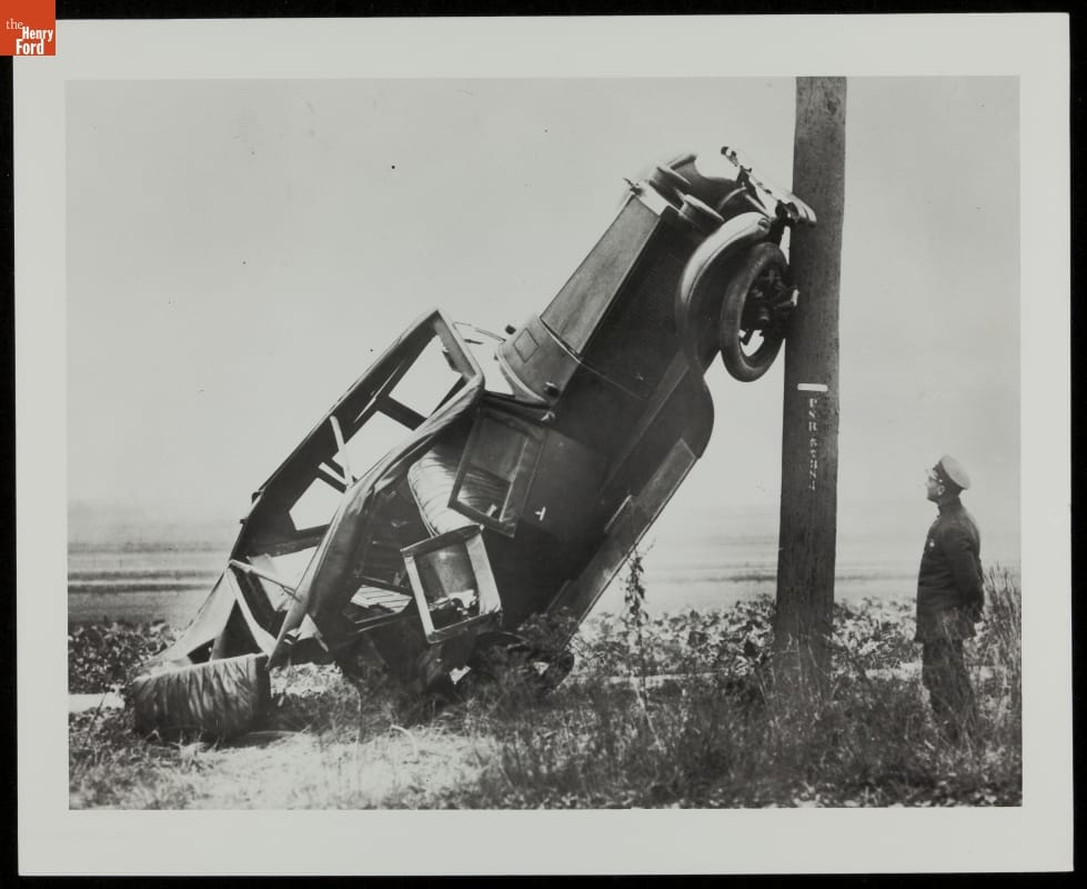 Automobiles are fast, powerful, and potentially dangerous. Accidents like the wreck pictured here became more commonplace as automotive speeds and the number of drivers on American roads rapidly increased in the 20th century. Eventually, manufacturers, governments, and drivers themselves were compelled to improve automotive safety.