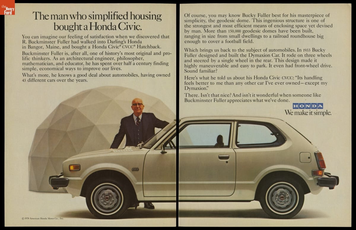 "The Man Who Simplified Housing Bought a Honda Civic," Honda Civic Advertisement Featuring R. Buckminster Fuller, 1978