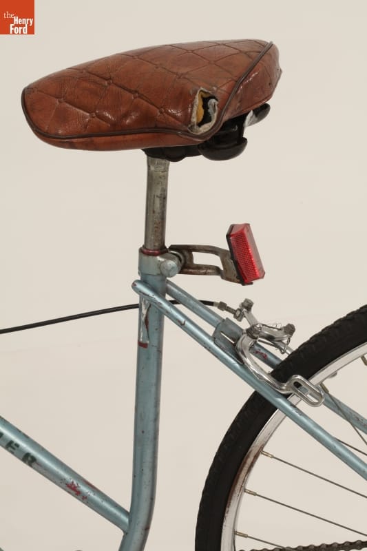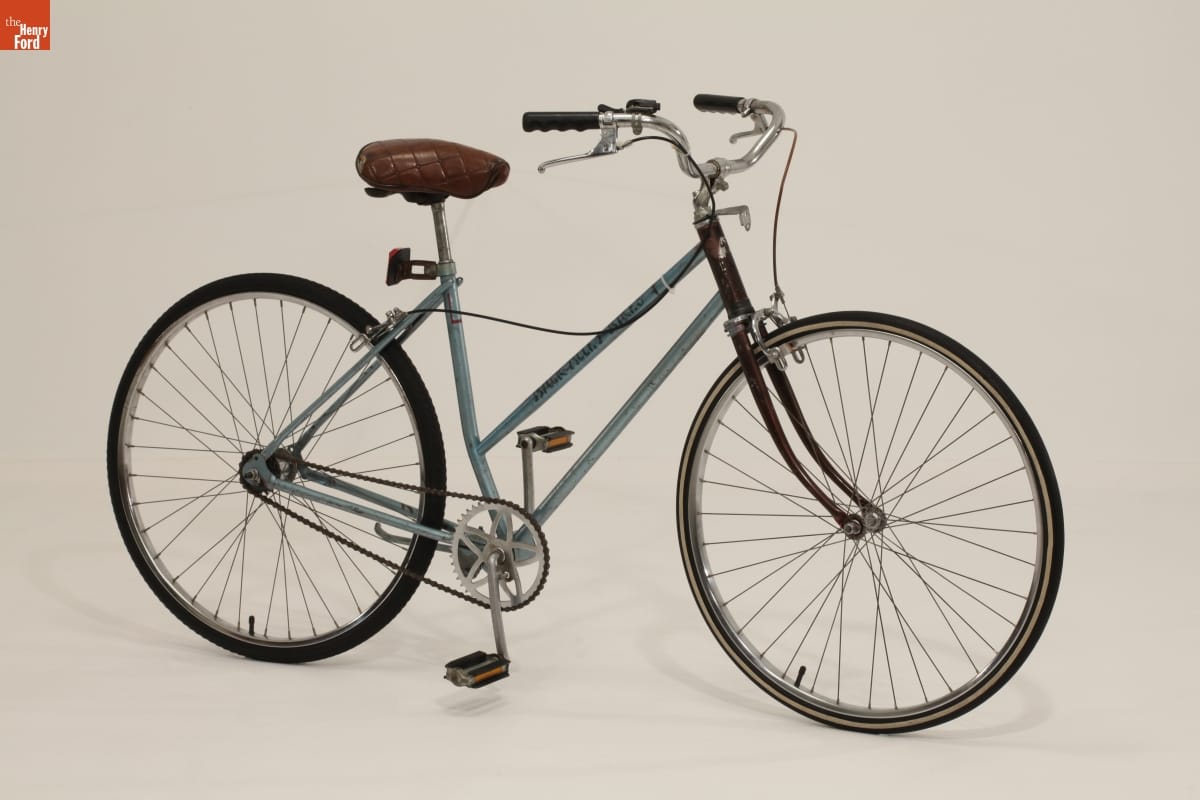 This bike was built by a youth participant in the Back Alley Bikes earn-a-bike program at The Hub of Detroit, a nonprofit, collectively run community bike shop. Made of miscellaneous parts mounted onto a trusty Schwinn town bike frame, this bike demonstrates the increased attention to making things in the 2000s -- both as an outlet for creativity and as a tool for community empowerment.