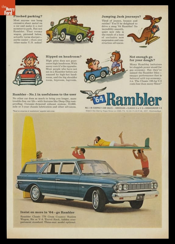 For 1964, AMC offered Rambler with a station wagon body in three different series. The basic Rambler American wagon included a six-cylinder engine and started at $2,240. The mid-level Rambler Classic started at $2,445 and could be purchased with either six- or eight-cylinder power. The top-line Rambler Ambassador wagon started at $2,985 and came exclusively with a V-8.