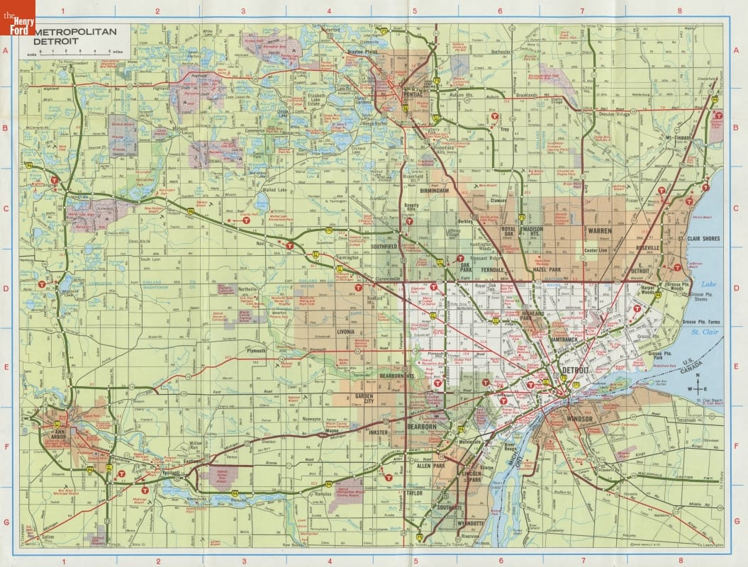 By the time of this 1968 map, a vast network of freeways through southeast Michigan had not only accelerated the move of thousands of people (mostly white) out of the city of Detroit but also provided access to the many new suburban automobile plants that had previously been located downtown.