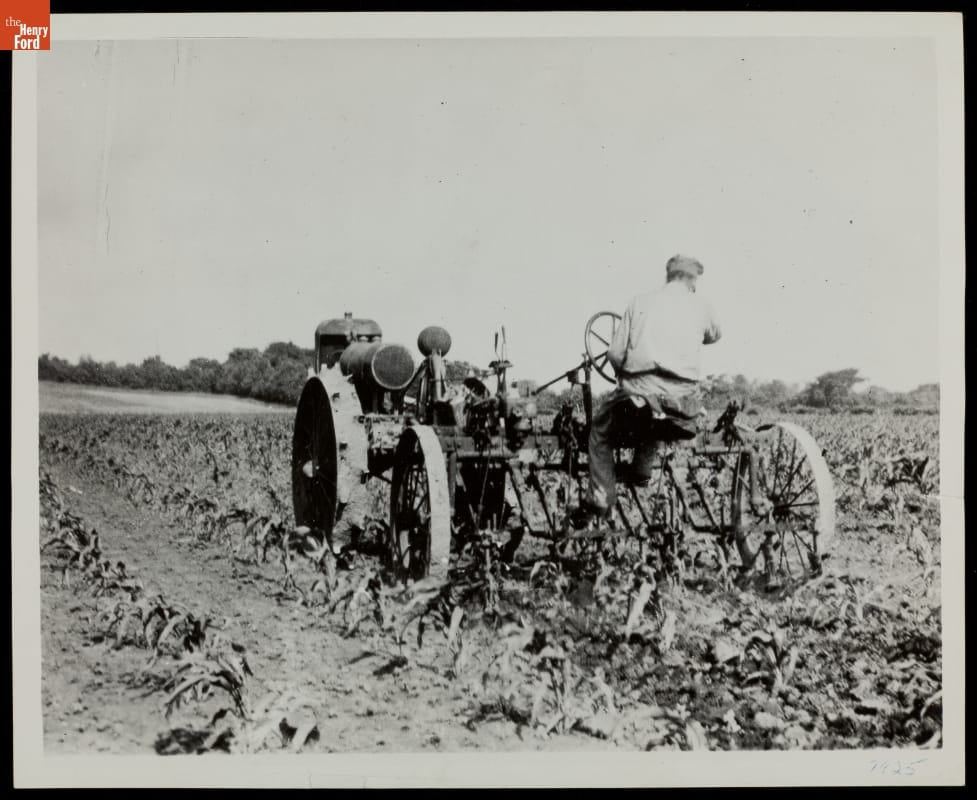 Farmer on Tractor, Cultivating Corn Field, circa 1916