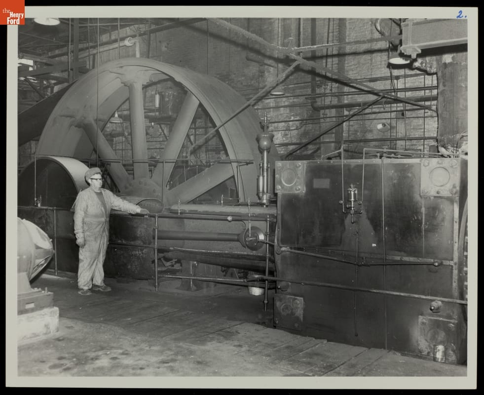 Machine Operator Standing with Steam Engine in Engine Room, Ohio circa 1950