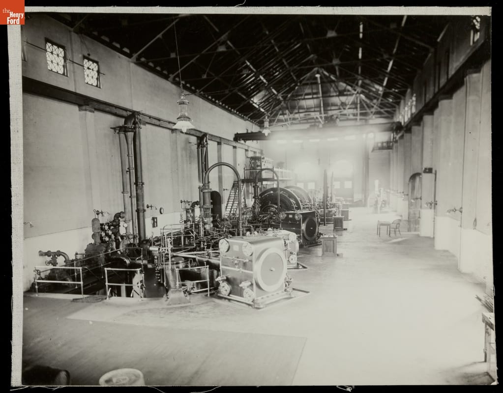 Steam powered most American factories by the late 1800s, and steam engines generated power in engine rooms like this well into the 20th century. From here, a system of belts, pulleys, and shafts conveyed the energy to factory machines.