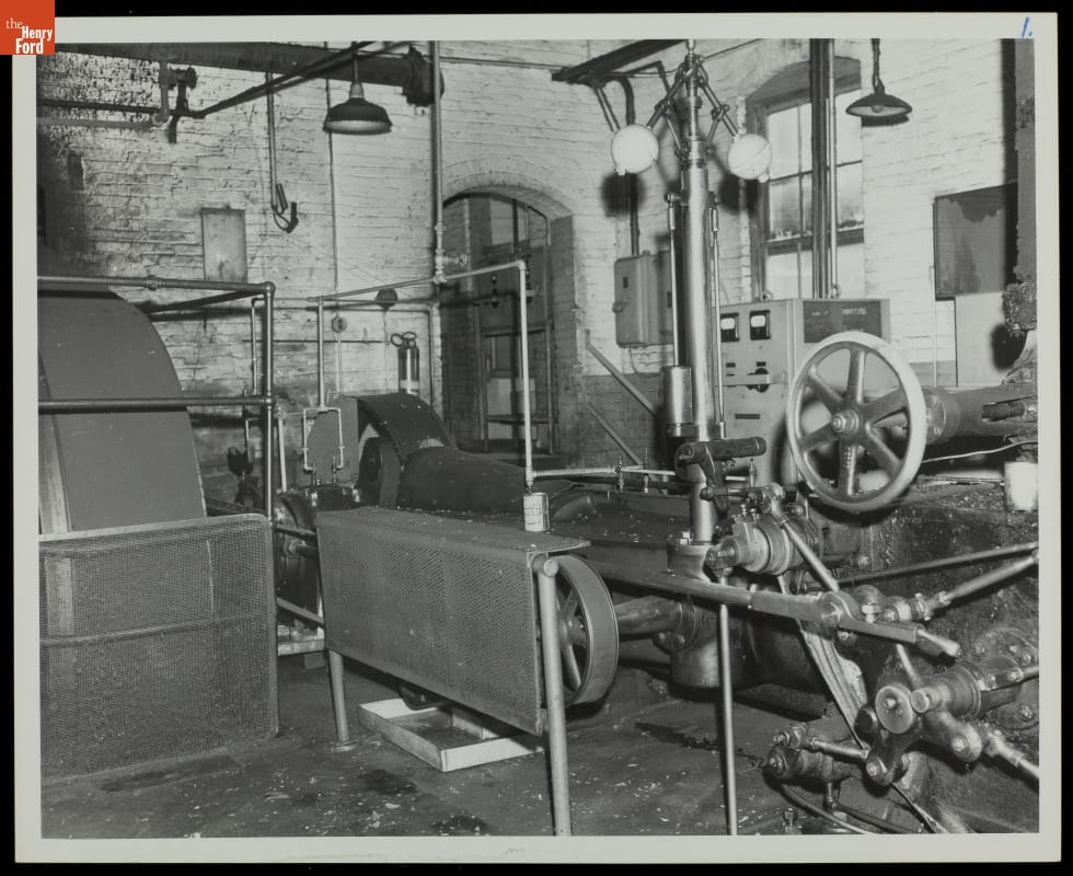 Steam powered most American factories by the late 1800s, and steam engines generated power in engine rooms like this well into the 20th century. From here, a system of belts, pulleys, and shafts conveyed the energy to factory machines.