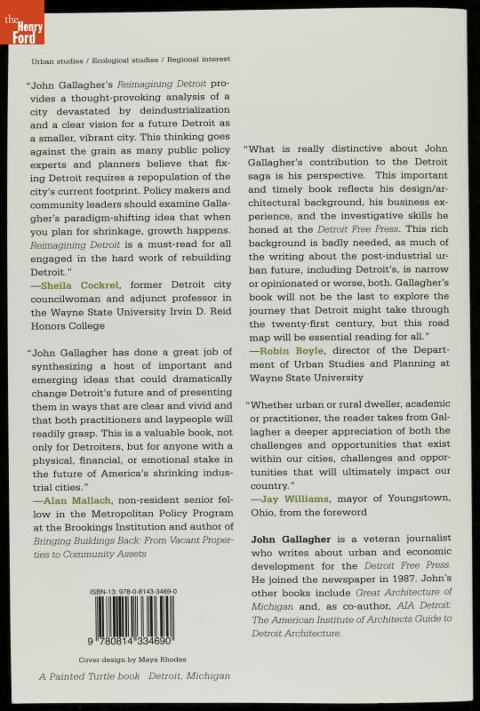 Cars have been blamed for many of Detroit's current economic and social problems. But the hard times it has been experiencing are, in fact, similar to those of other industrial cities. In this book, journalist John Gallagher lays out the premise that Detroit can use its rich legacy of innovation to propel itself into a more viable future.