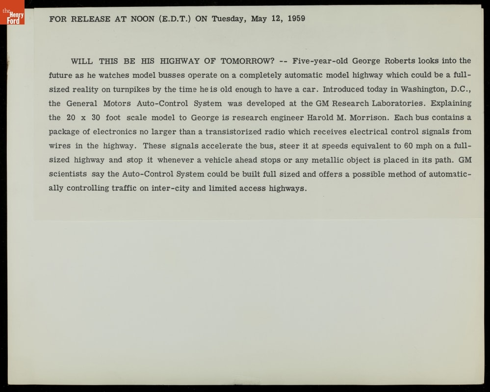 Americans had struggled through the Depression and sacrificed during World War II, but by the 1950s, things were finally looking up. People living with the benefits of the machine age believed life would continue to improve, and automotive manufacturers expressed this sense of optimism. This futuristic model of an automatic highway was envisioned and created by researchers at General Motors.
