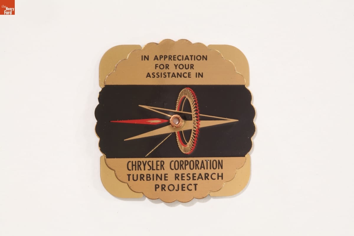 Front: IN APPRECIATION / FOR YOUR / ASSISTANCE IN / CHRYSLER CORPORATION / TURBINE RESEARCH / PROJECT
