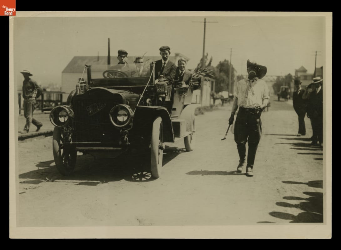 Buffalo Bill Walking with a Group of Men Seated in a White Steam Car, circa 1906