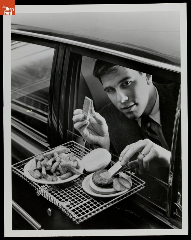 Spreading Mustard on a Hamburger at a Drive-In Restaurant, circa 1965