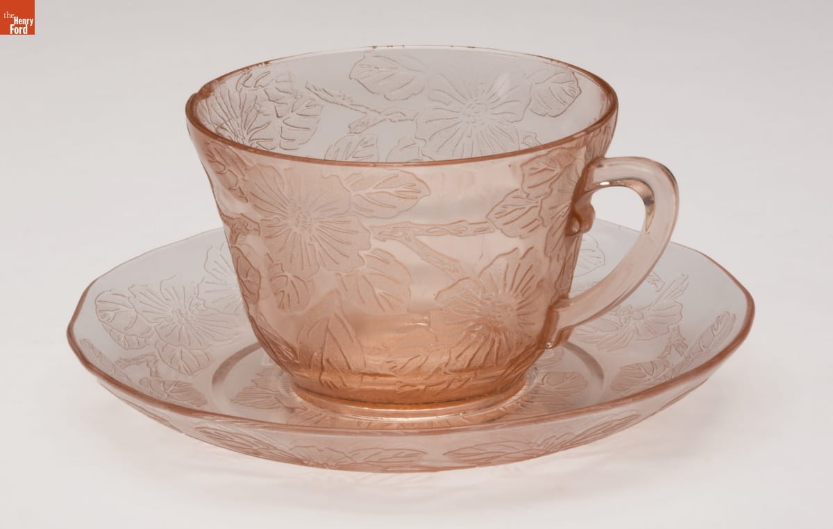 During the 1930s, some American glass manufacturers produced inexpensive, pressed glass serving ware. The glassware, which came in a variety of colors and scores of distinct patterns, could be bought at many lower-end retailers as well as through catalogue merchants. Movie theaters and other businesses also gave it away -- intending to lure the cash-strapped Depression-era public inside.
