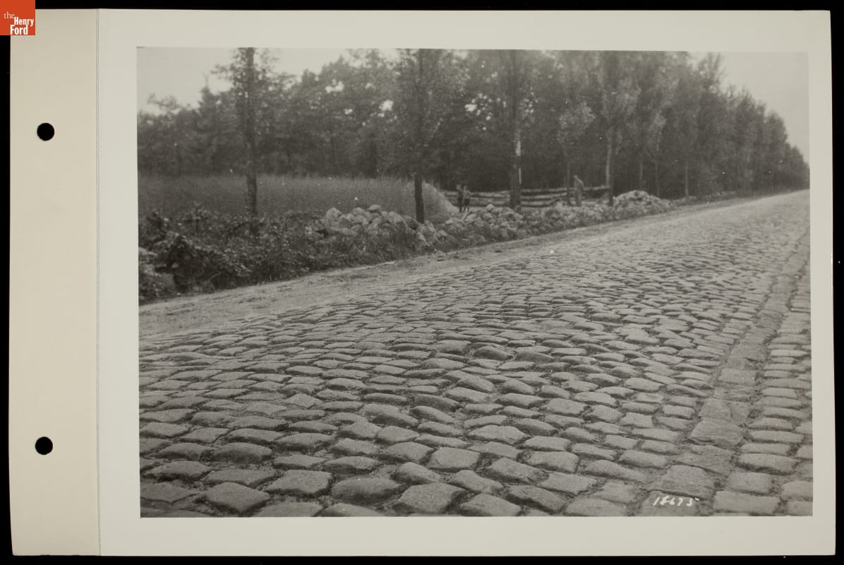 "Roads of the World" was part of the Ford Rotunda in Dearborn, Michigan. Visitors rode new Ford vehicles through reproductions of famous roadways from around the world. Ford spent $176,000 landscaping the attraction into historic and modern sections. To ensure a realistic, immersive experience, crews used reference photographs--like this one--to recreate the 19 "Roads of the World."