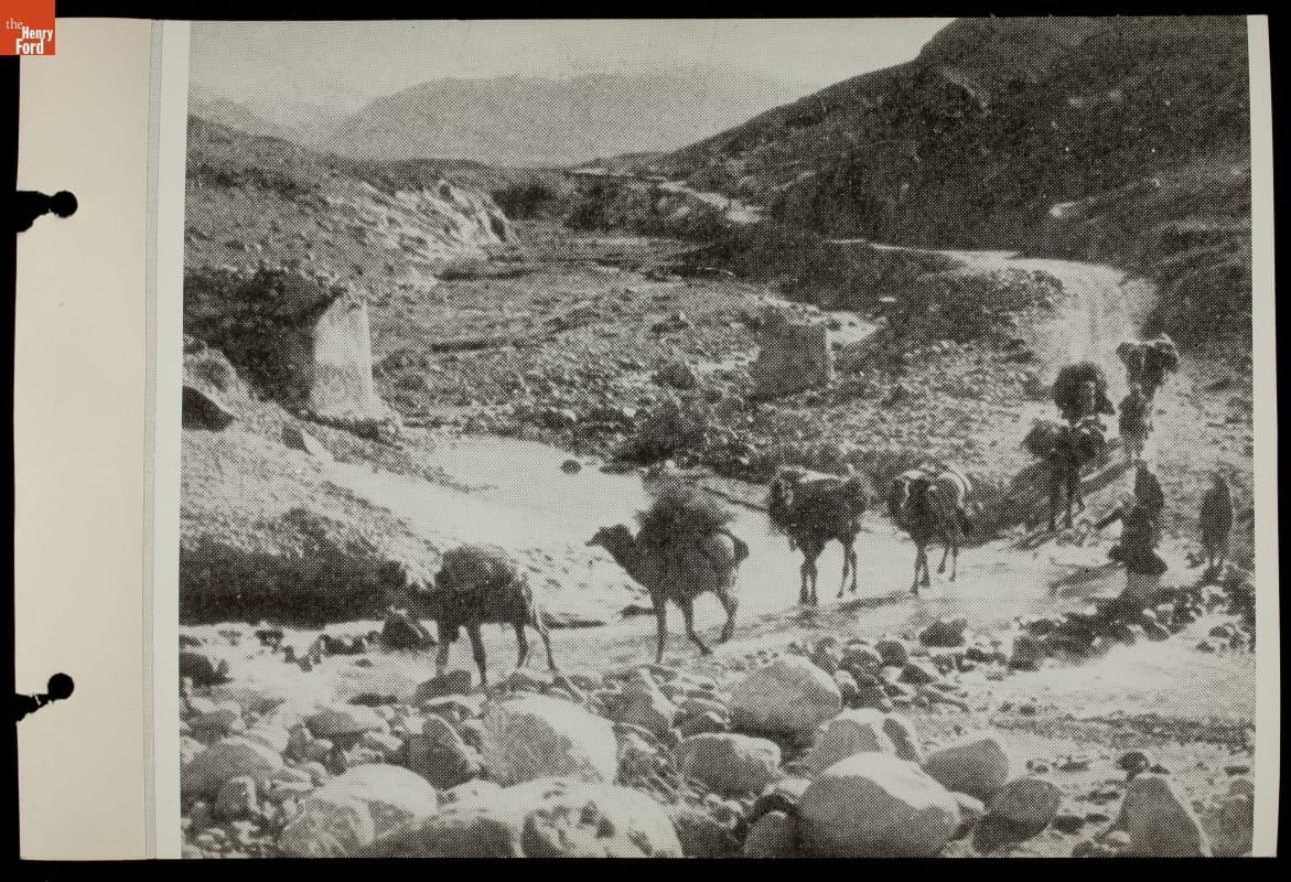 Camel Pack Train Crossing a Stream on a Stone Road, 1934