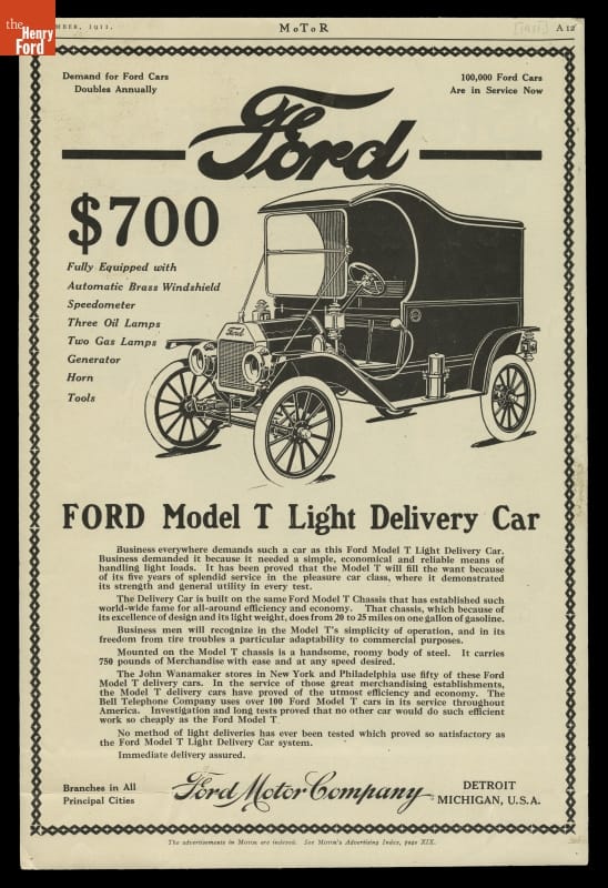 Ford Motor Company's light delivery car was based on its Model T automobile, using the same chassis and the same four-cylinder, 20-horsepower engine. The delivery car featured a wooden body with two doors at the rear. Prices started at $700 -- as prominently noted in this advertisement.