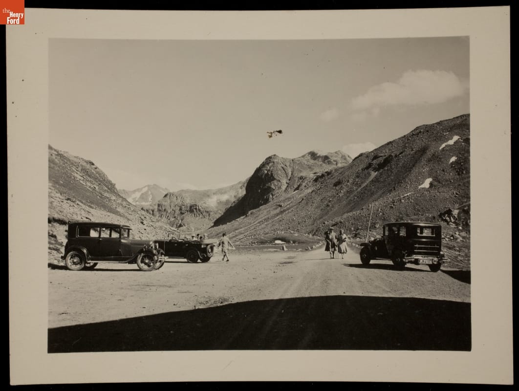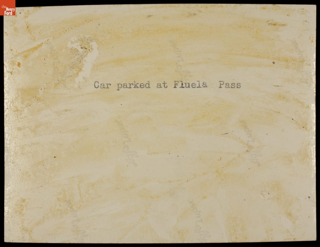 In 1913, Henry Ford established Ford Motor Company's photographic department. Though few internal records describe company photography, remaining photographs reveal a wide range of departmental activity. Over nearly 100 years, Ford photographers documented company ventures, personal affairs, and daily life around the world. In this photograph, motorists visit Fluela Pass, a historic route through the Swiss Alps.