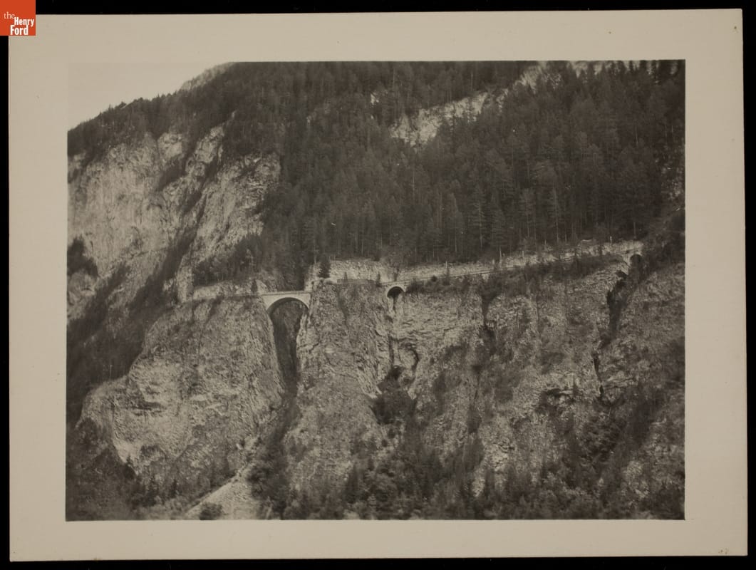 In 1913, Henry Ford established Ford Motor Company's photographic department. Though few internal records describe company photography, remaining photographs reveal a wide range of departmental activity. Over nearly 100 years, Ford photographers documented company ventures, personal affairs, and daily life around the world. This photograph shows Fluela Pass, a historic route through the Swiss Alps.