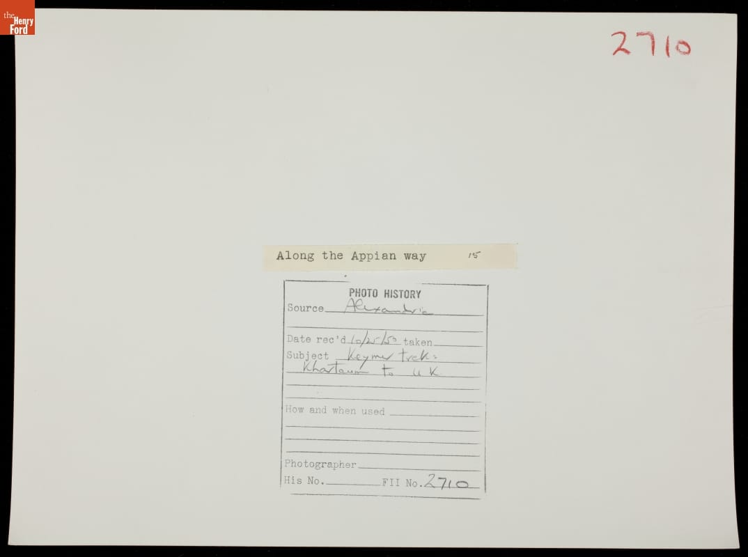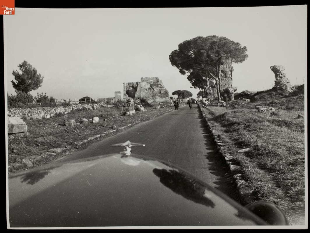 In 1913, Henry Ford established Ford Motor Company's photographic department. Though few internal records describe company photography, remaining photographs reveal a wide range of departmental activity. Over nearly 100 years, Ford photographers documented company ventures, personal affairs, and daily life around the world. This photograph, taken from an automobile, captured people and ruins along an ancient Roman road in Italy.