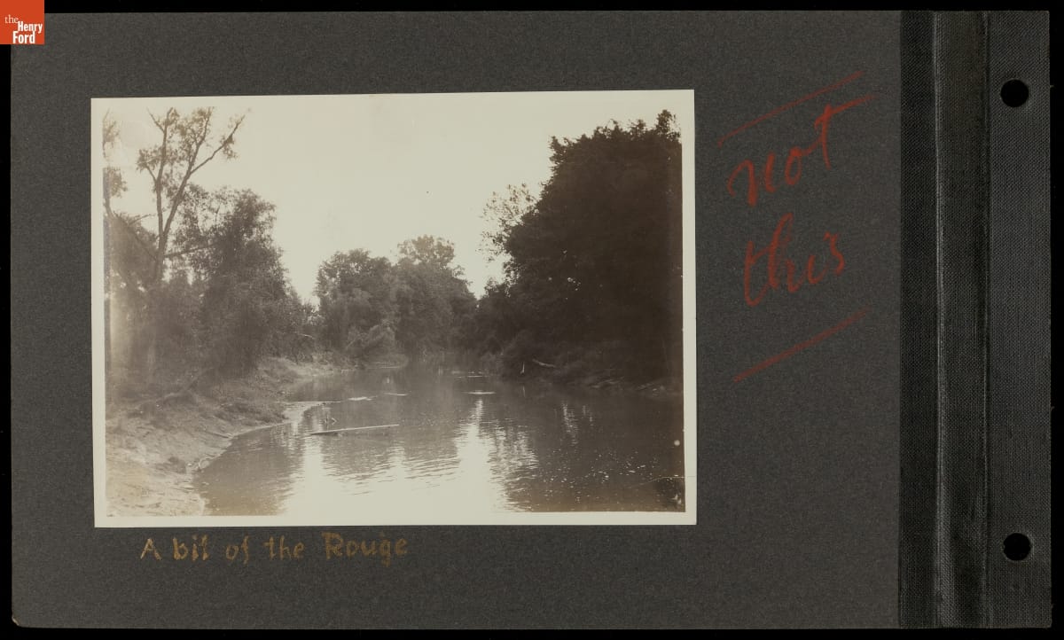 This photograph shows a section of Metro Detroit's River Rouge in 1910, around the time Henry Ford selected it as the site for a new factory. To accommodate large ships that would bring in raw materials or take finished product for delivery from the Ford Rouge plant, the lower part of the river had to be channelized, widened, and dredged.