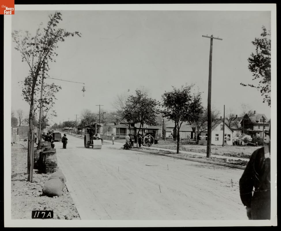 By the 1910s, most township and county road commissions in the United States were supported by state highway departments. This substantial local construction project probably received funding, equipment, or materials form the state. In this photograph, a steam traction engine powers a heavy roller over a residential roadway in preparation for paving.