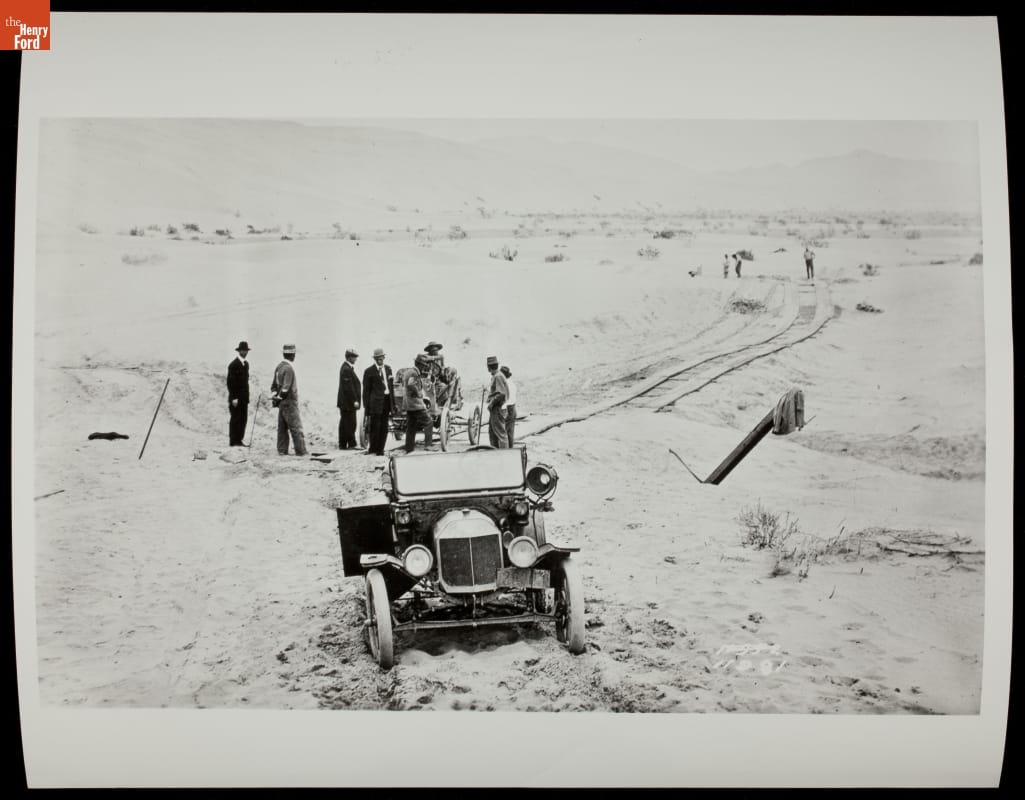 "Roads of the Pacific" was part of the Ford Exhibit, the most popular attraction at the 1935 California Pacific International Exposition. Visitors rode in brand new Ford V-8s over 14 reproductions of famous roads. Crews used reference photographs to construct a realistic, immersive visitor experience. This image helped them recreate a plank road that crossed dunes in the southwestern United States.