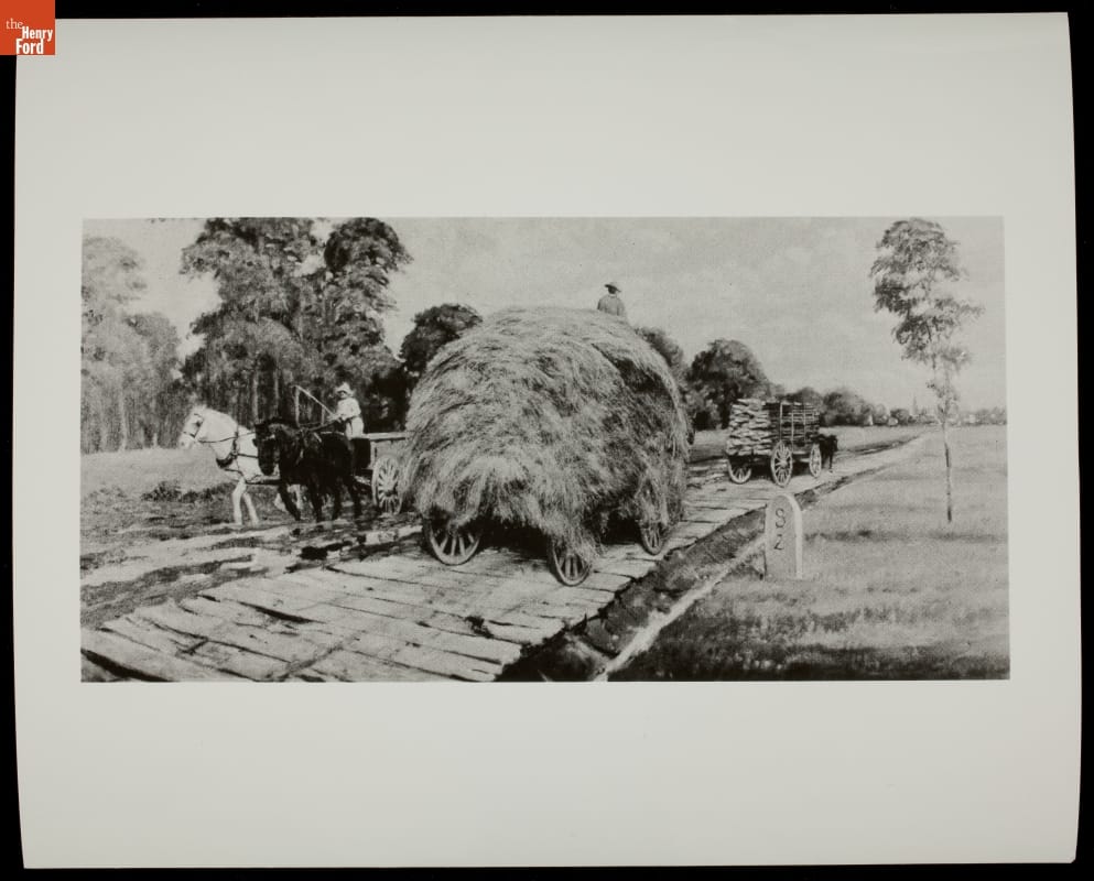 Photo of Graphic Depicting a Loaded Hay Wagon on a Wooden Road, circa 1845