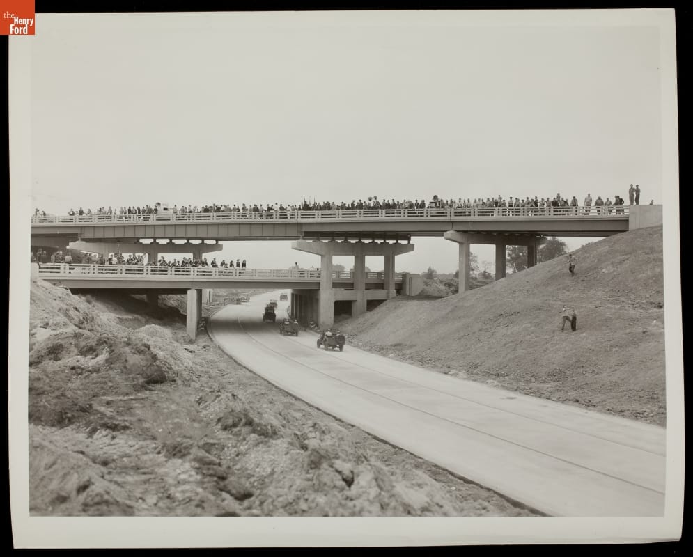 Willow Run, built by Ford Motor Company to mass produce B-24 bombers during World War II, was more than 20 miles from Detroit. Workers rapidly constructed a new expressway, with state-of-the-art grade separations, to connect the plant with existing roads. Crowds celebrated the highway's completion -- one of many urgent wartime defense preparations -- at this dedication ceremony in 1942.