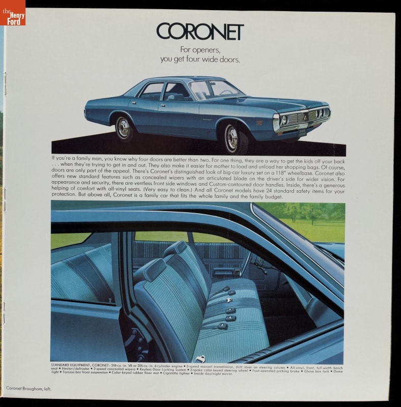 Dodge first used the Coronet name in 1949 and it continued across seven design generations through 1976. Charger debuted for 1966 as a more upscale pony car to compete with models like Mercury's Cougar. For 1971, Charger was available in several high-performance versions, while Coronet was positioned as a family car with sedan and station wagon body styles.