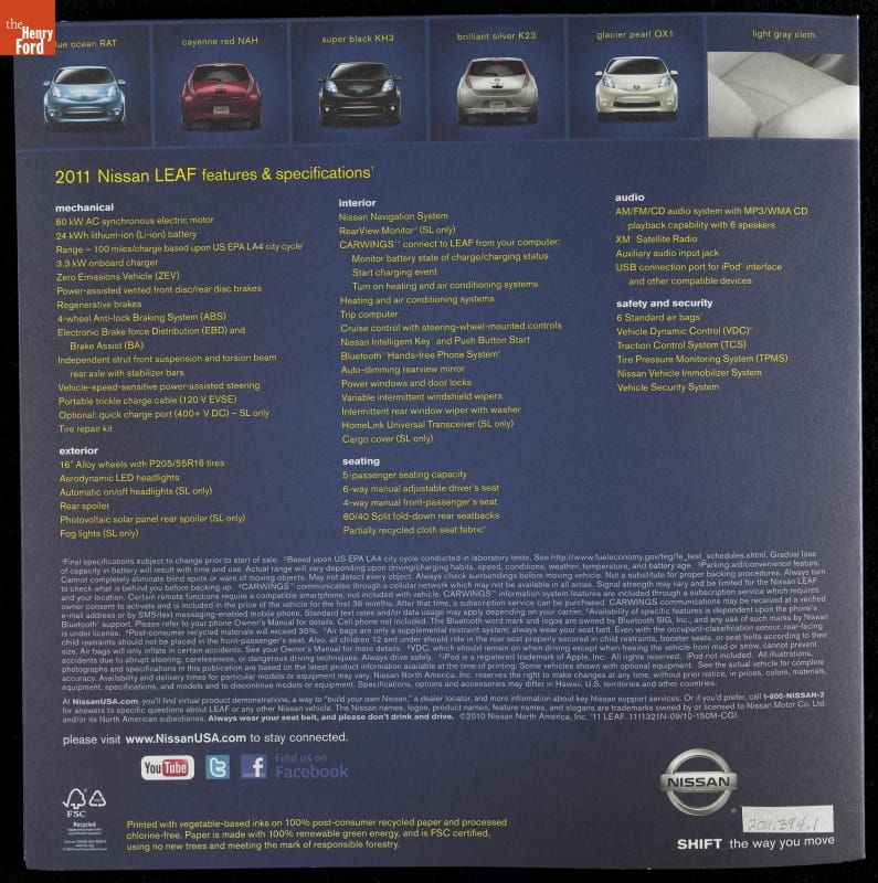 2011 Nissan Leaf Sales Brochure, "The 100% Electric, No-Gas Nissan Leaf"
