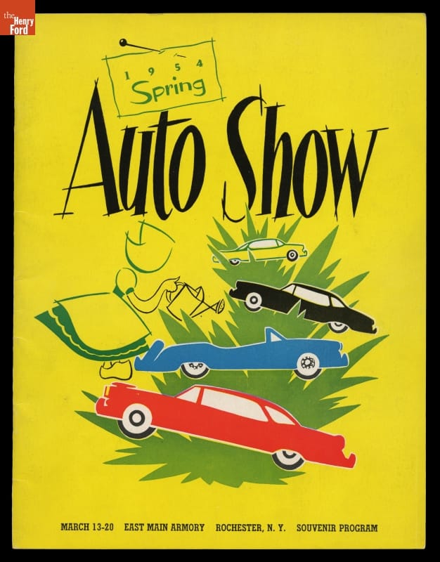 Auto shows use glamour, giveaways, spectacle, and sex appeal to show off manufacturers' latest offerings. Part entertainment and part consumer education, auto shows have their roots in 19th Century industrial exhibitions and world's fairs. New York City hosted America's first auto show in 1900 and the idea caught on. Paying crowds took away this program from the 1954 Rochester, New York, show.