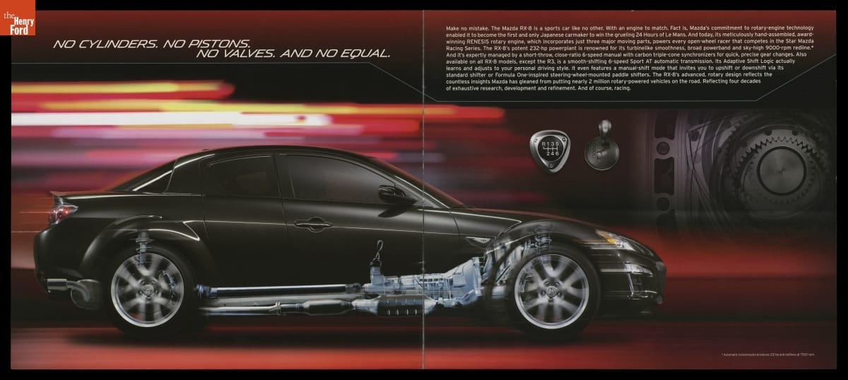 This sales brochure for the 2011 Mazda RX-8 emphasized the mechanical simplicity of the engine. Mazda produced this car with a high-performance rotary engine, and marketed it with the tag line: "No cylinder. No pistons, No valves. And no equal."