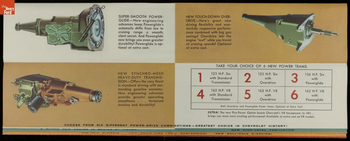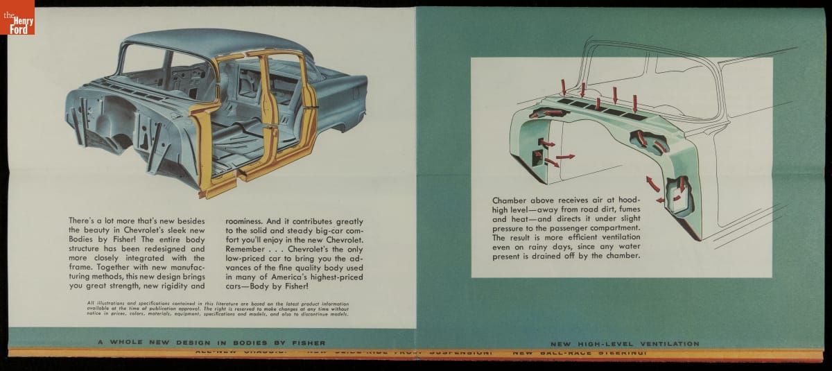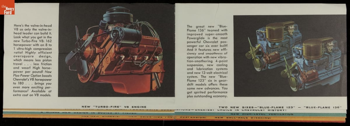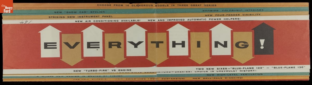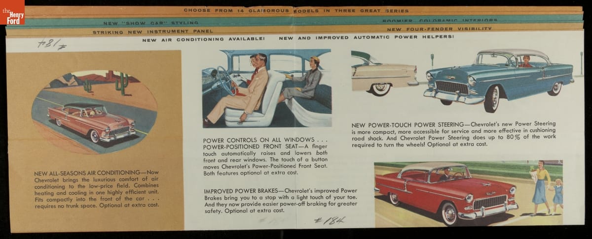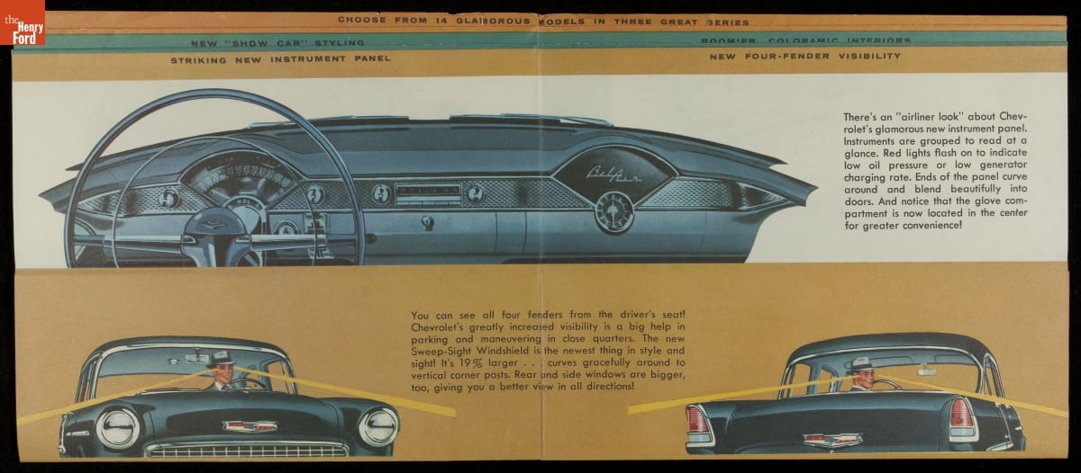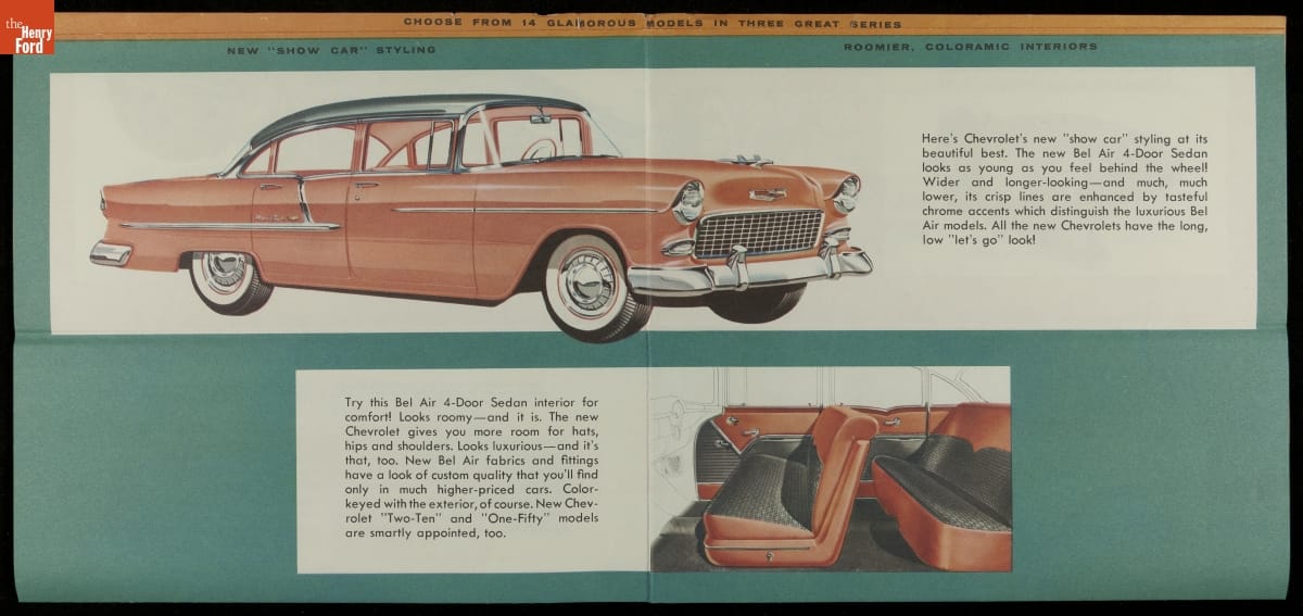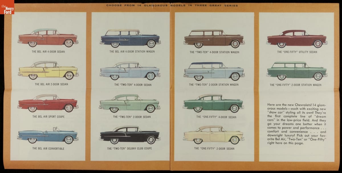 This sales catalog for Chevrolet epitomized the style and color choices of mid-1950s American cars. Inside the catalog was a two-page spread that showed 14 new Chevrolet "glamorous" models -- including 5 different Bel Airs -- each with "exciting new 'show car' styling."