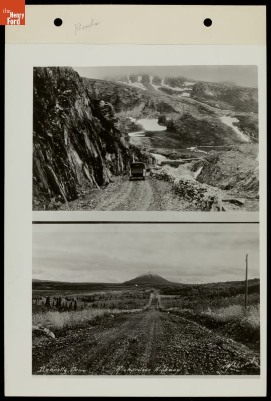"Roads of the Pacific" was part of the Ford Exhibit, the most popular attraction at the 1935 California Pacific International Exposition. Visitors rode in brand new Ford V-8s over 14 reproductions of famous roads. Crews used reference photographs to construct a realistic, immersive visitor experience. These images helped them recreate a section of Richardson Highway, Alaska's first major road.