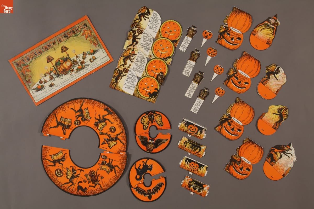 Printed on envelope: HALLOWE'EN PARTY DECORATIONS / MADE IN USA / THE BEISTLE CO. / HALLOWE'EN TABLE DECORATIONS FOR A PARTY OF FOUR - 30 PIECES / THIS PACKAGE CONTAINS LAMP SHADES, CANDLE HOLDERS, INVITATIONS, PLACE CARDS, NUT CUPS AND ICE CREAM OR FRUIT DECORATIONS