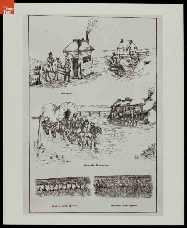 In the 19th century, road improvements in the United States tended to be private efforts financed by investors and supported by tolls. This illustration shows two methods of road construction. The Telford system used a base layer of stone blocks and an upper layer of smaller interlocking stones to support the road surface. Macadam (or McAdam) roads eliminated the stone-block foundation.