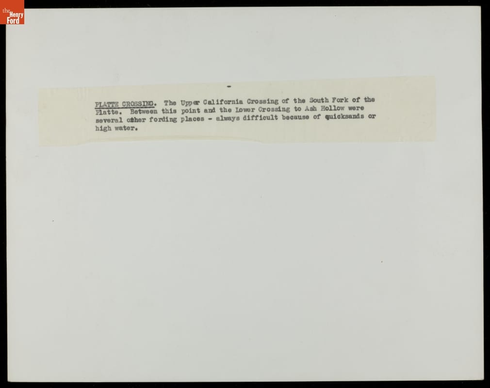 In 1913, Henry Ford established Ford Motor Company's photographic department. Though few internal records describe company photography, remaining photographs reveal a wide range of departmental activity. Over nearly 100 years, Ford photographers documented company ventures, personal affairs, and daily life around the world. This photograph shows an illustration of an Overland Trail wagon train fording the Platte River.