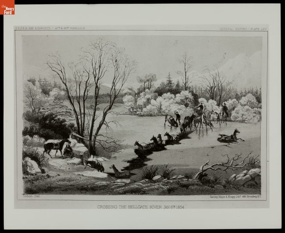 In the early 1850s, the United States government sent out survey parties to explore four possible transcontinental railroad routes. Illustrators accompanied these expeditions and created prints that became part of the final report. One team investigated the northernmost route from St. Paul, Minnesota, to Washington's Puget Sound. The print copied in this photograph depicts the perilous crossing of Montana's frozen Hellgate River along this route.