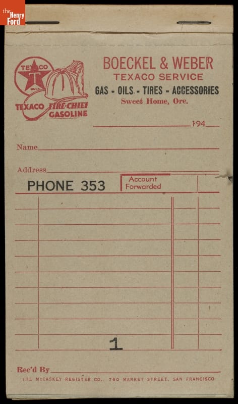 Receipt Pad for Boeckel & Weber Texaco Service Station, Sweet Home, Oregon, circa 1945