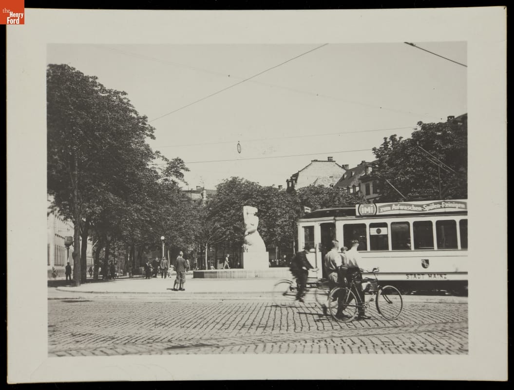 Bicycles were a popular mode of local transportation for many Europeans during the interwar years of the 1920s and 1930s. While some American urban streets bustled with automobiles, you could find scenes like the one in this photograph in Europe. Cyclists and a streetcar travel down the street of 1930s Mainz, Germany -- not one automobile is visible.