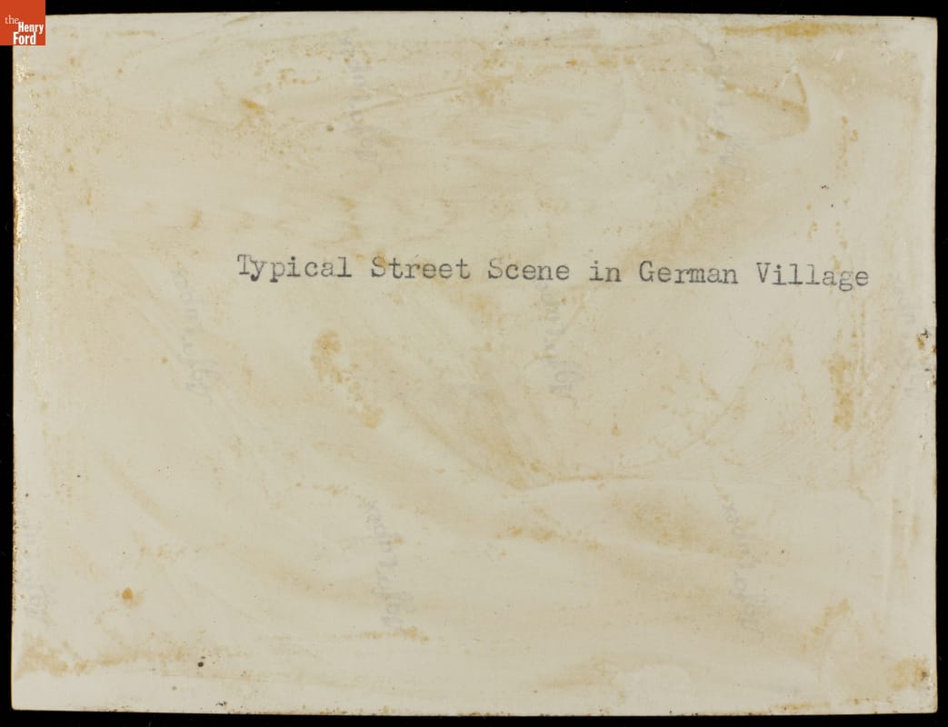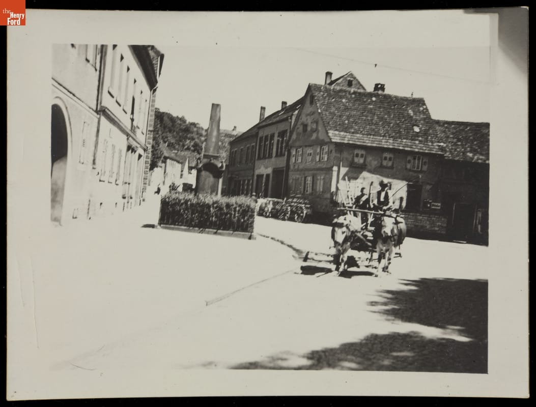 In 1913, Henry Ford established Ford Motor Company's photographic department. Though few internal records describe company photography, the remaining photographs reveal a wide range of departmental activity. Over nearly 100 years, Ford photographers documented company ventures, personal affairs, and daily life around the world. This photograph shows an ox-drawn vehicle on a street in Germany.
