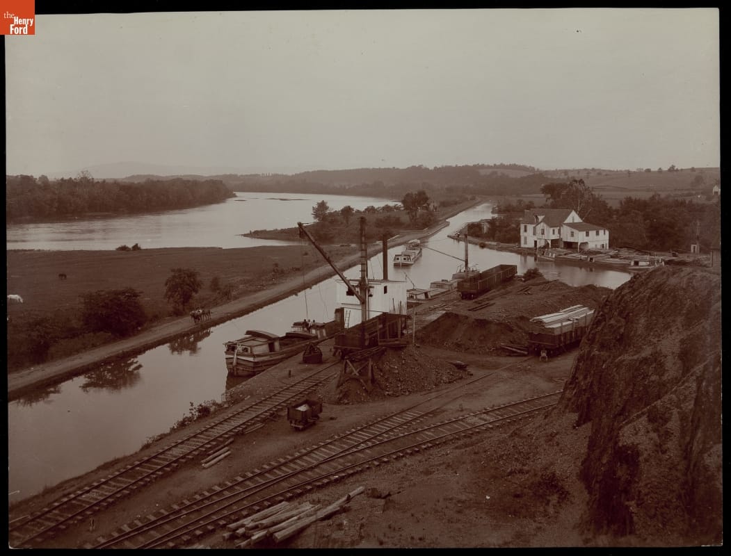 President George Washington was devoted to improving the Potomac, the only river bisecting the Appalachian mountain barrier and an important trade route. Americans have continued work on the waterway, constructing canals to allow for the passage of rafts and boats. This Detroit Publishing Company photograph shows the river, a lateral canal, and tracks connecting waterway to railway.