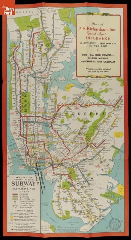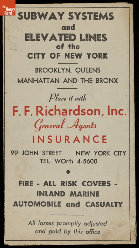 This map of New York City transit systems was produced in the 1930s as advertising material for an insurance company. The map includes subway routes, points of interest-and information about F.F. Richardson, Inc. insurance.