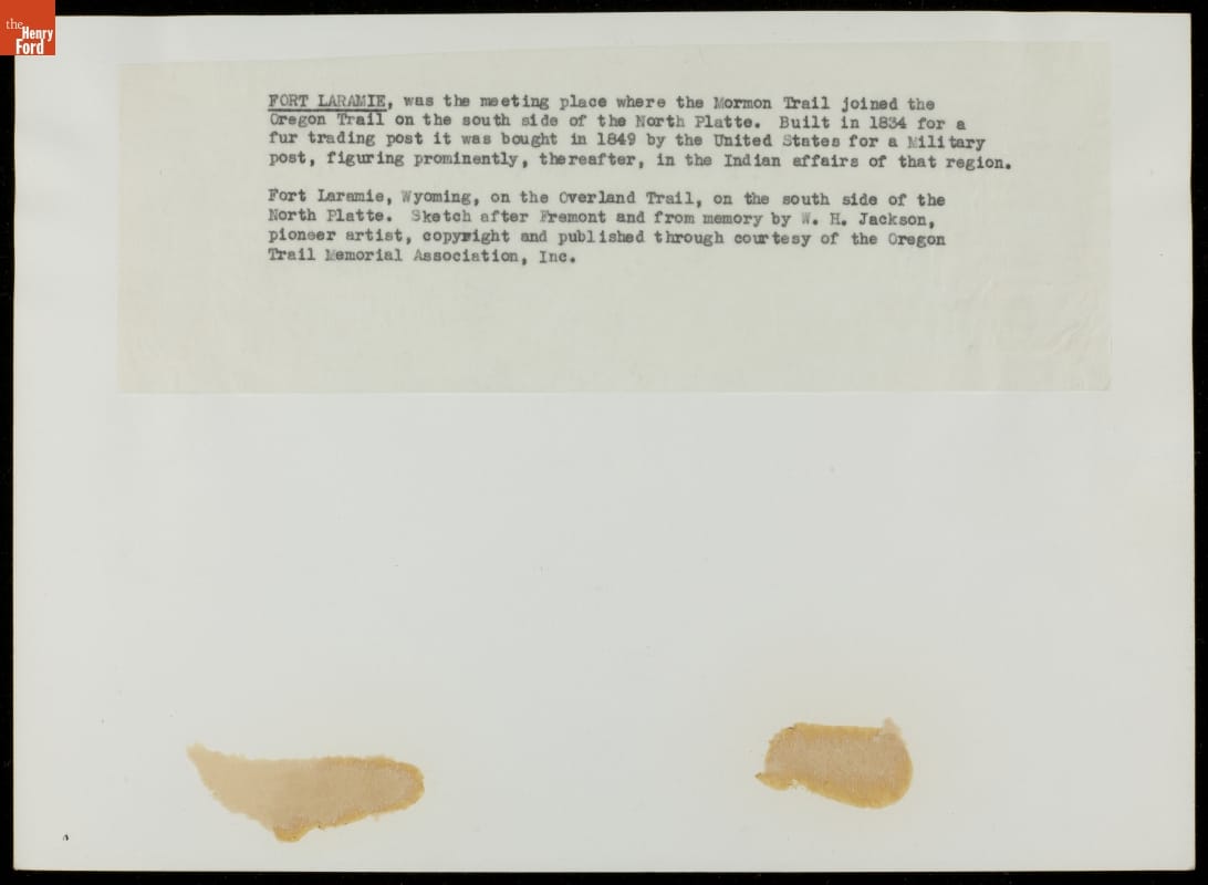 For Laramie, Wyoming on the Overland Trail, on the south side of the / North Platte. Sketch after Fremont and from memory by W.H. Jackson, / pioneer artist, copyright and published through courtesy of the Oregon / Trail Memorial Association, Inc.