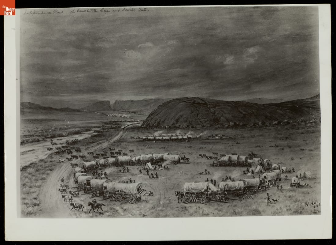 Sketch of circa 1840 Wagon Train at Independence Rock, Sweetwater River and Devil's Rock, Wyoming