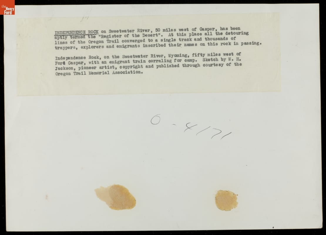 INDEPENDENCE ROCK on Sweetwater River, 50 miles west of Caspar (sic), has been / aptly termed the "register of the Desert". At this place all the detouring / lines of the Oregon Trail converged to a single track and thousands of / trappers, explorers and emigrants inscribed their names on this rock in passing. /