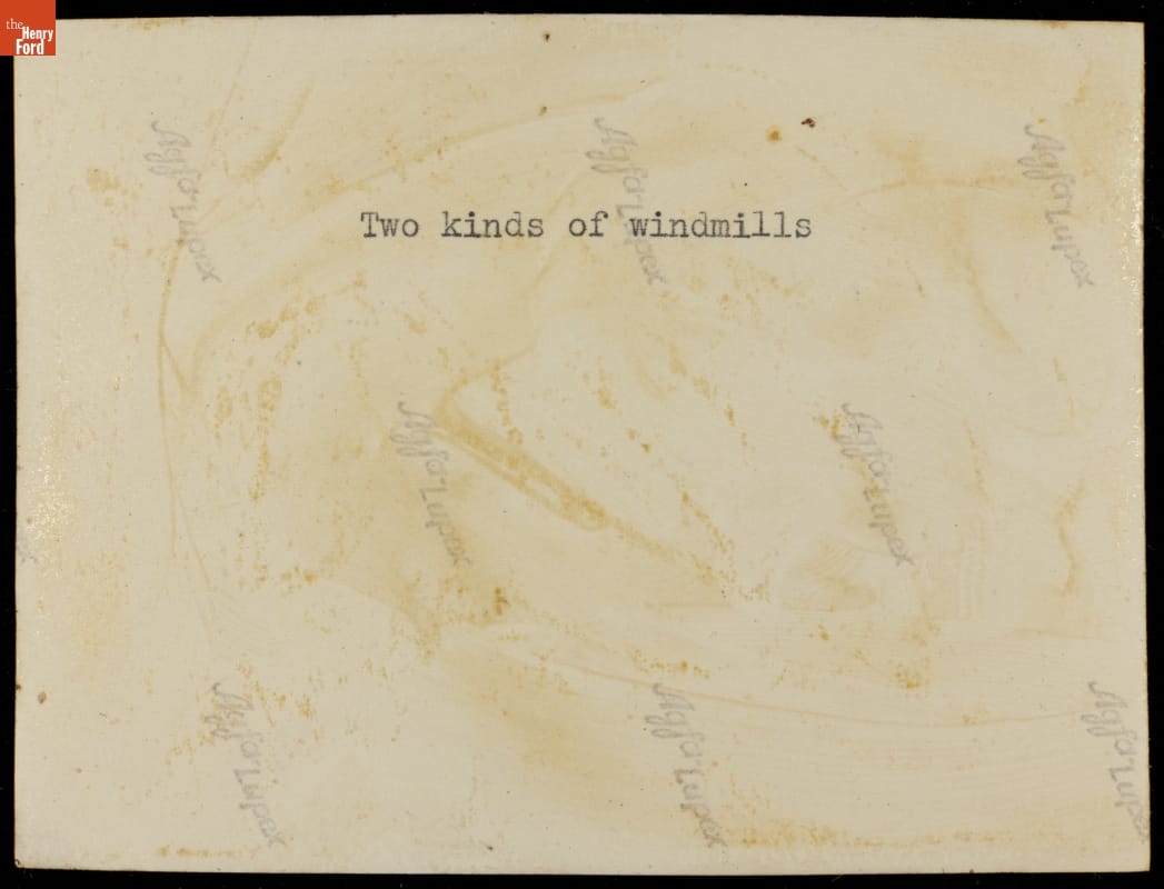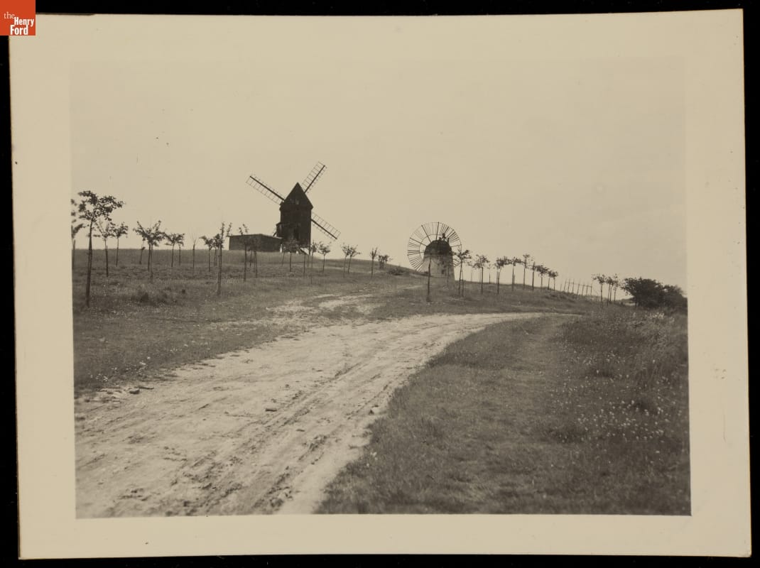 In 1913, Henry Ford established Ford Motor Company's photographic department. Though few internal records describe company photography, remaining photographs reveal a wide range of departmental activity. Over nearly 100 years, Ford photographers documented company ventures, personal affairs, and daily life around the world. This photograph shows a couple of windmills near a dirt road in an unidentified location.