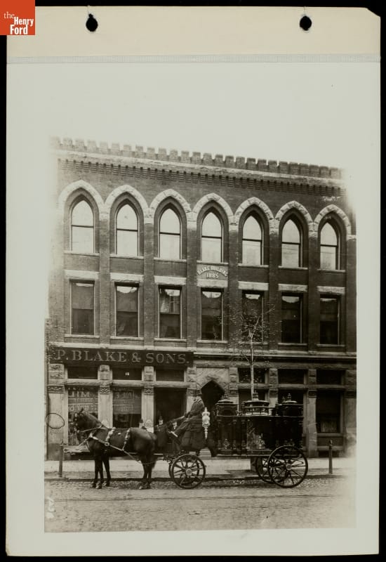 This photo shows a horse-drawn hearse outside P. Blake & Sons, a "funeral furnisher." Patrick Blake, the original proprietor, had been a furniture maker before selling caskets and other funeral supplies. The transition from furniture maker to undertaker was common in the 19th century, as furniture makers and woodworkers made caskets before the growth of the funeral industry.