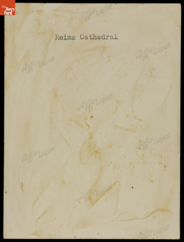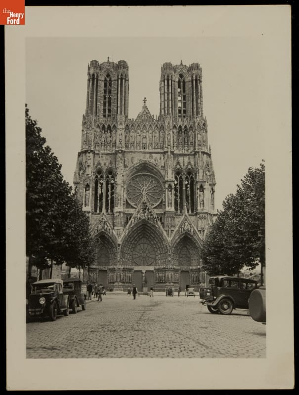 In 1913, Henry Ford established Ford Motor Company's photographic department. Though few internal records describe company photography, remaining photographs reveal a wide range of departmental activity. Over nearly 100 years, Ford photographers documented company ventures, personal affairs, and daily life around the world. This photograph shows automobiles and visitors outside Notre-Dame de Reims, a Roman Catholic cathedral in France.