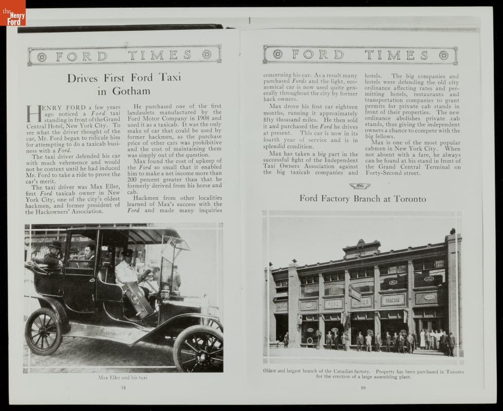The ever-adaptable Ford Model T proved suitable for taxicab service. This article from Ford Times, Ford Motor Company's magazine, relates the story of New York City cab driver Max Eller and his Model T taxi. Mr. Eller chose the T for the same reasons that many private owners favored the car: its low price and modest operating costs.