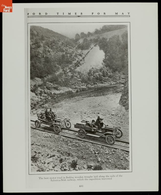 This photograph was taken during a World War I relief mission to Serbia, where poor road conditions complicated travel. For a stretch of 8 miles, a sinuous mountain road merged with the Salonica-Nish railway. These relief workers drive Ford Model Ts along the unusual combination roadway.